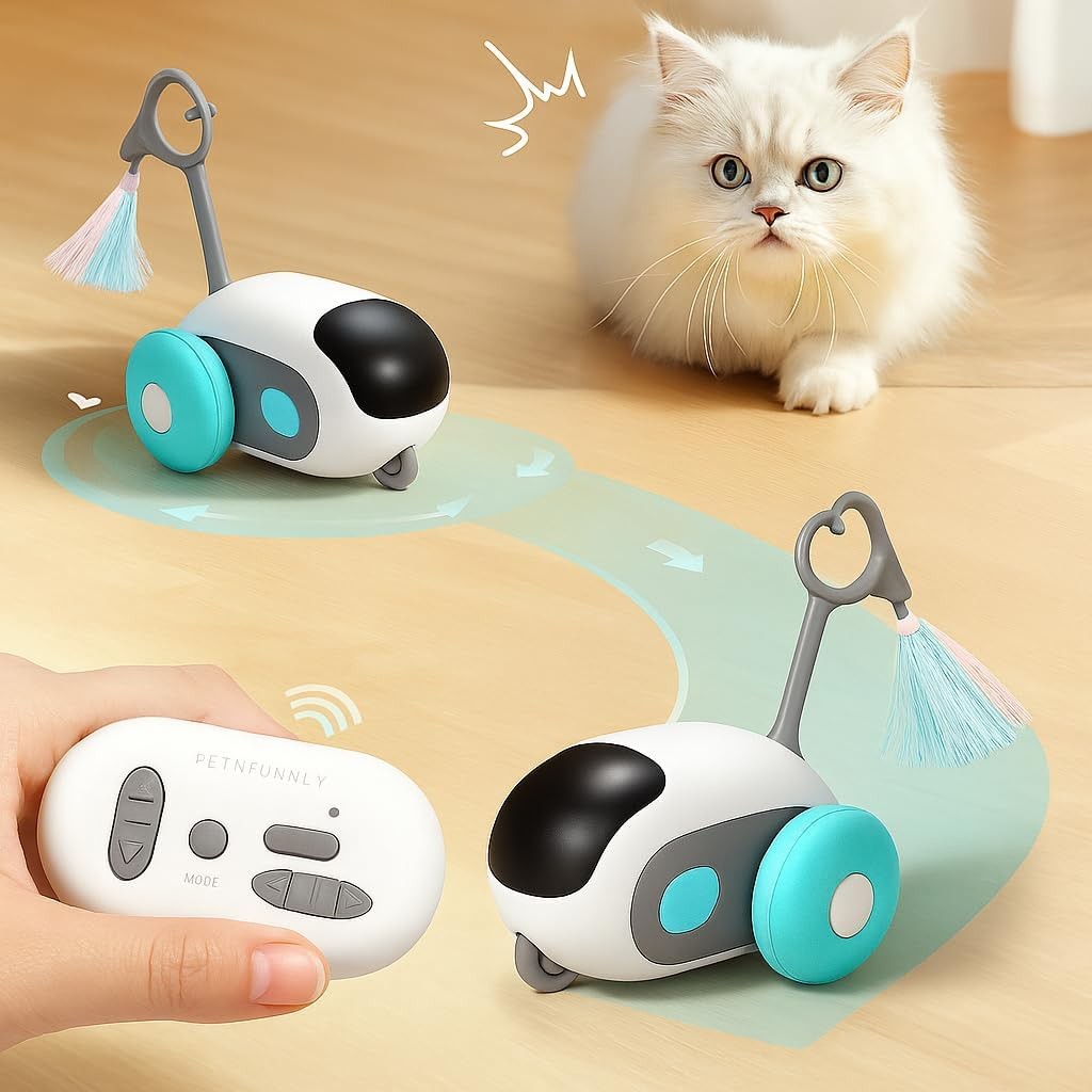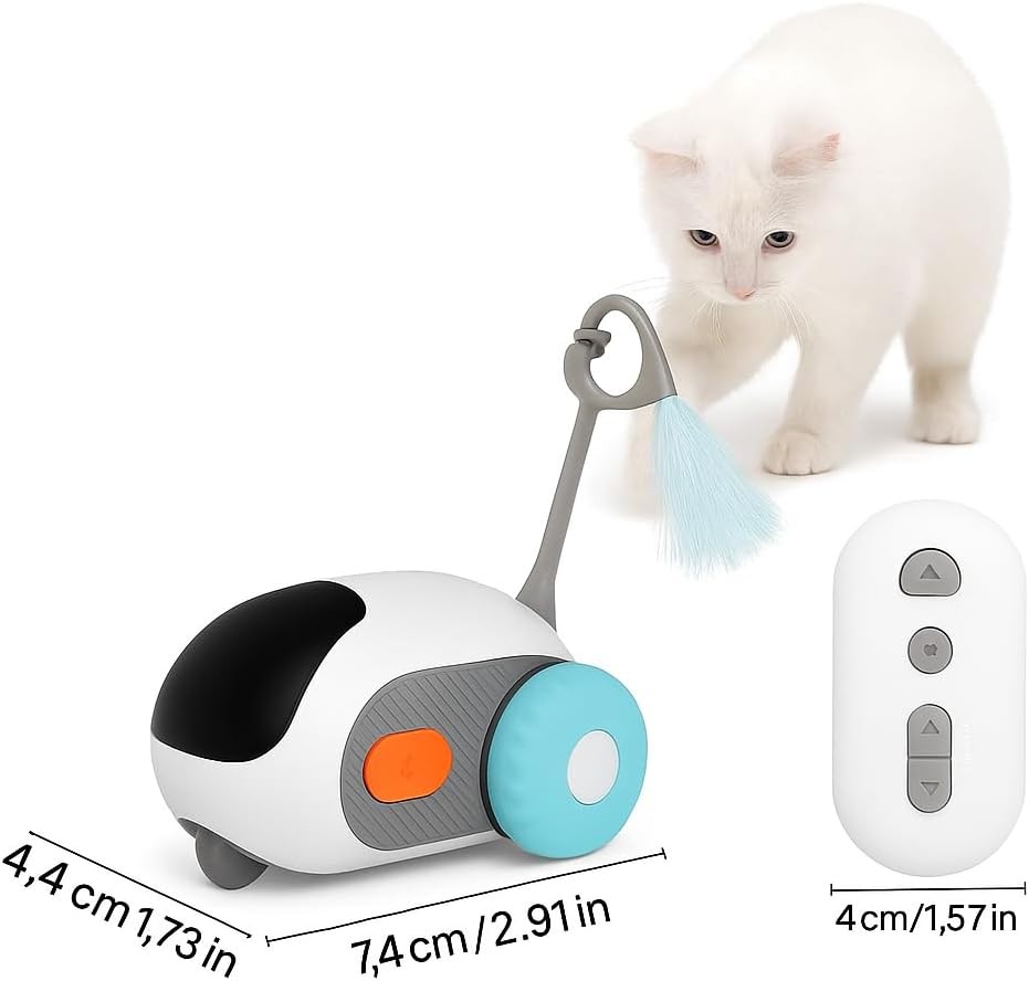 Keep your feline friend entertained for hours with this Interactive Smart Cat Toy — a remote-controlled, rechargeable robotic toy designed to stimulate your cat's natural hunting instincts. This innovative toy mimics unpredictable movement using its rotating wheels and fluffy tail attachments, encouraging your indoor cat or kitten to chase, pounce, and stay physically active.