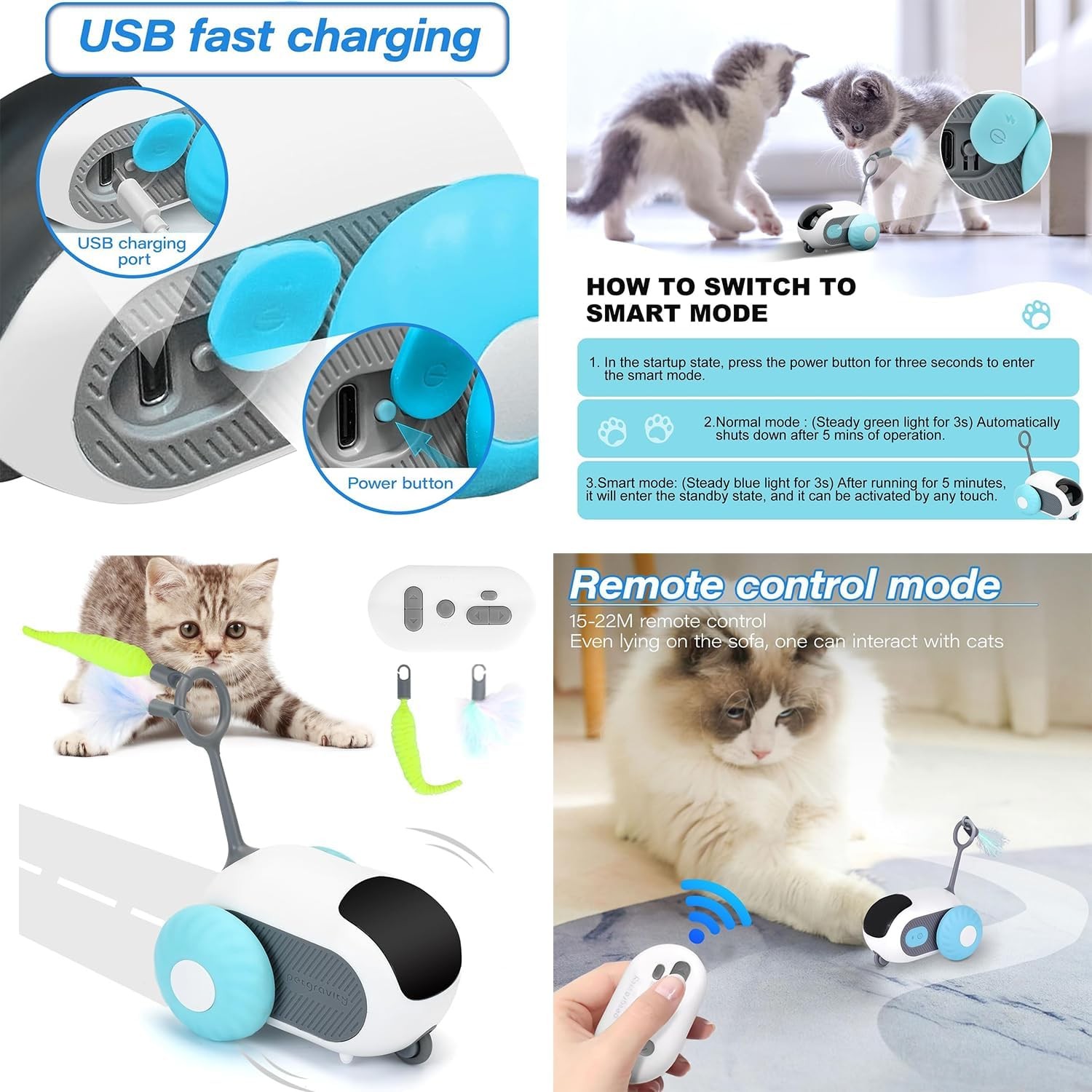Equipped with advanced obstacle-avoidance sensors, the toy automatically detects and navigates around furniture, walls, and other barriers. You can switch between two modes using the included remote control: Normal Mode for manual operation and Intelligent Mode for automatic play, allowing your cat to enjoy the fun even when you're not around.