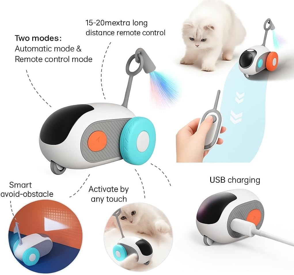The toy charges quickly via USB and offers long-lasting playtime without the hassle of replacing batteries. Its compact, pet-safe design is perfect for all cat breeds and ages, and the smooth wheels ensure quiet, scratch-free movement on any indoor surface.