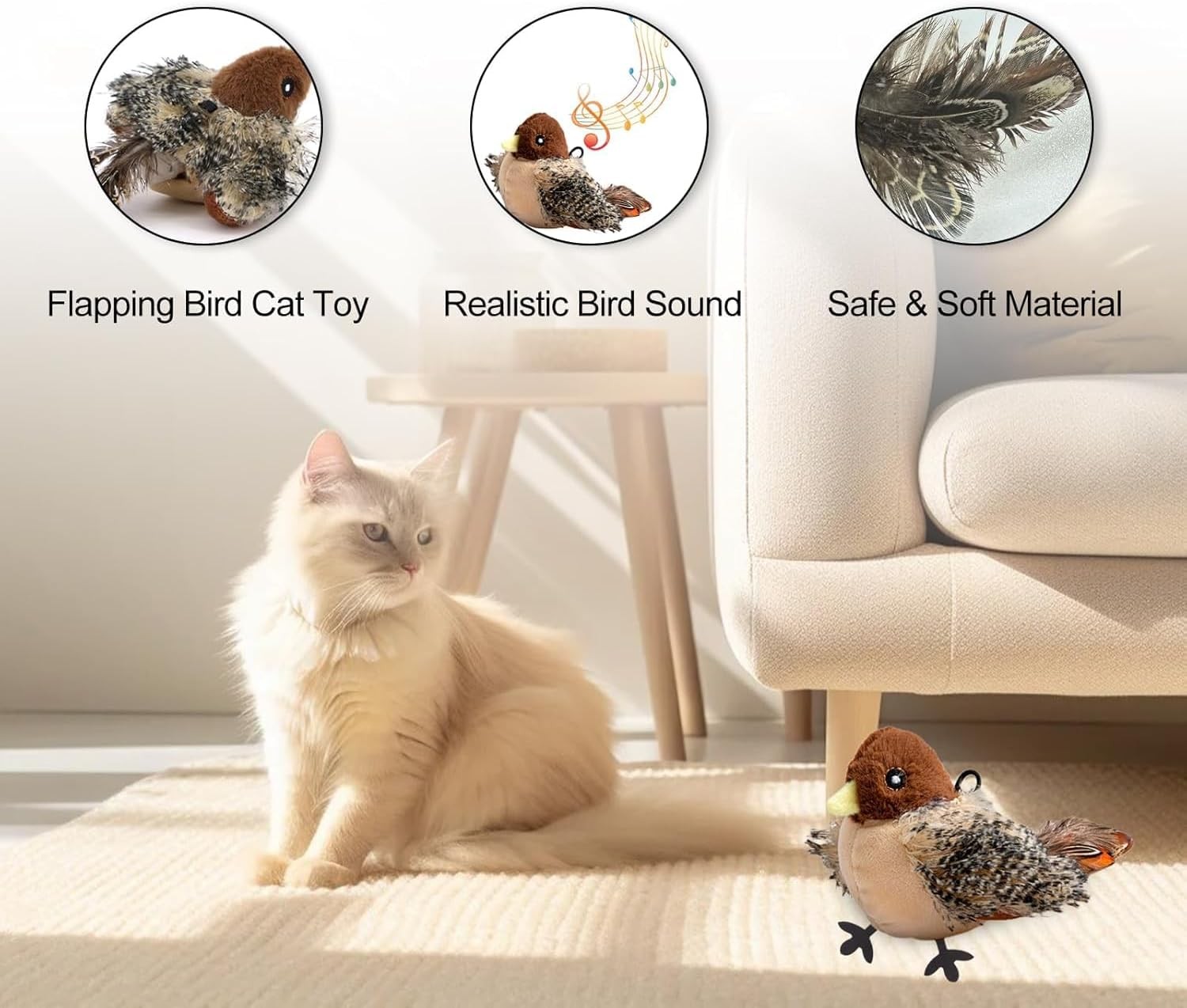 • Realistic bird sounds and flapping wings instantly grab your cat’s attention and awaken their natural hunting instincts.